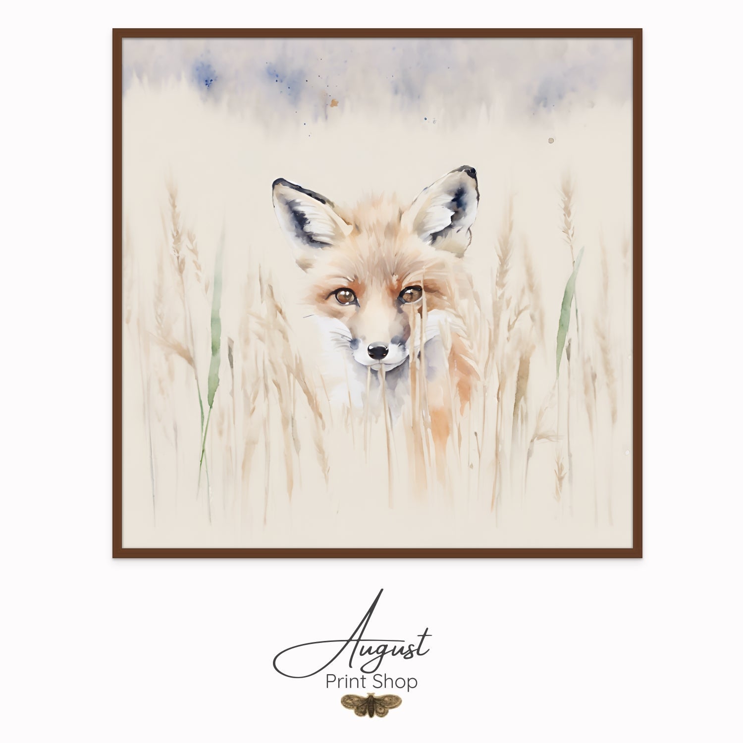 A soft and adorable watercolour painting style print on canvas of a red fox kit hiding in the tall, pale grass. A welcoming addition to any space. Cute and welcoming watercolor artwork on canvas.