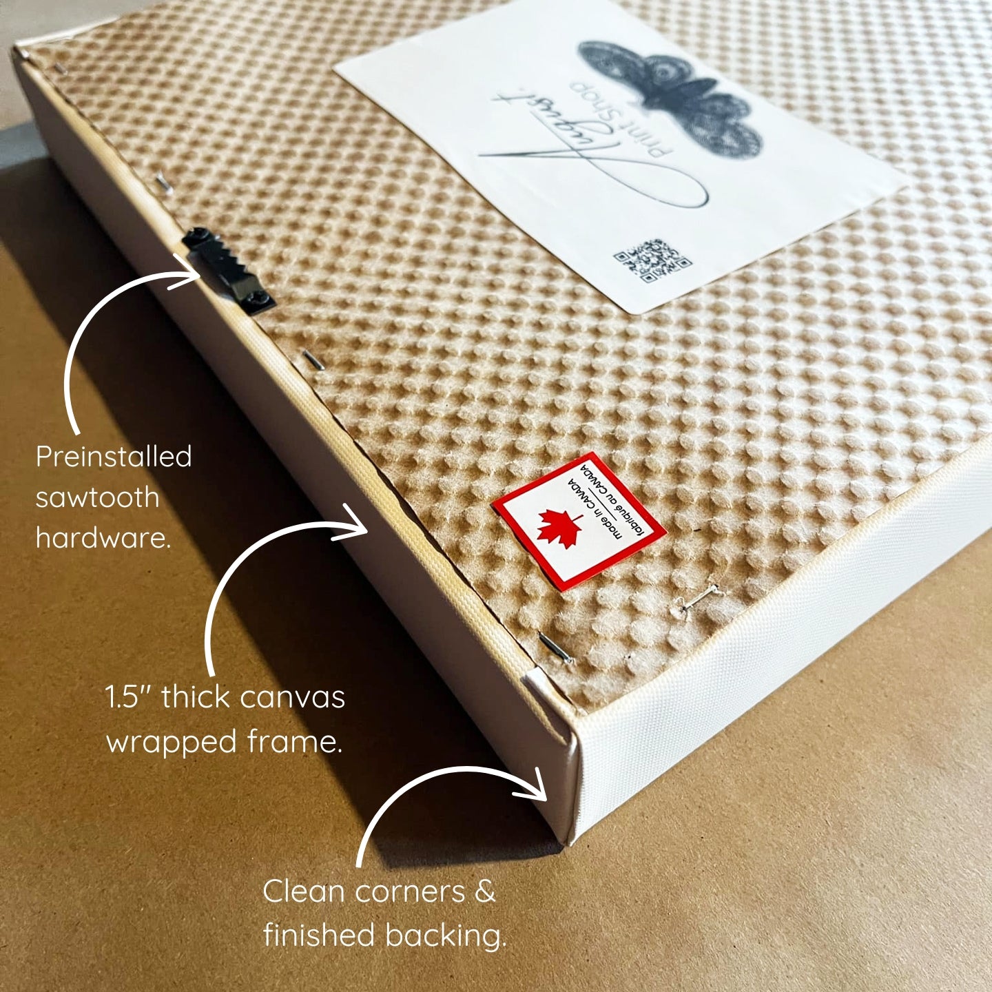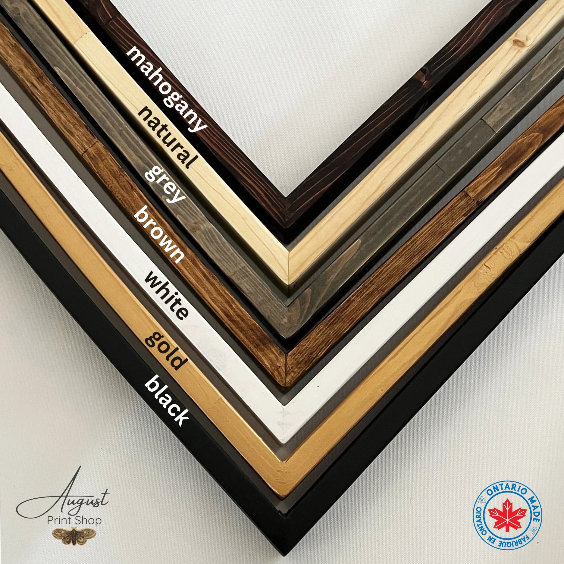 You have the option to add a solid wood frame around your framed canvas art. These frames are HAND MADE IN CANADA and therefor unique! They are made of hand sanded solid wood. They have a natural wood texture and their own natural grain patterns. Wood is jointed together on the frame and there may be some slight colour differences on the natural wood option.