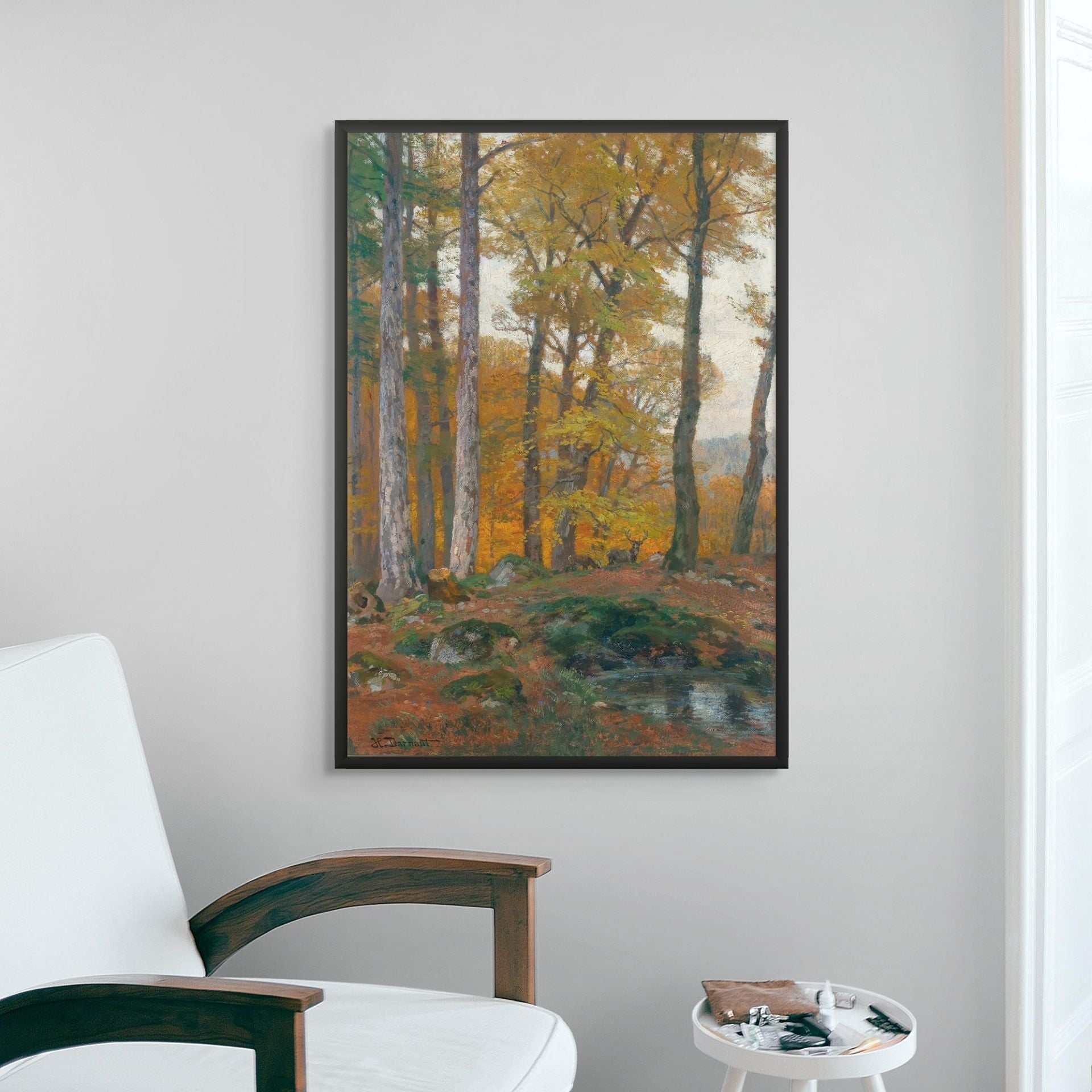Step into a golden woodland scene with this richly detailed autumn landscape by Hugo Darnaut. A Forest Glade with Stags in Autumn captures the quiet majesty of nature, where a group of stags stand peacefully in a sun-dappled clearing. The trees glow with warm autumnal tones—burnt orange, amber, and deep russet—while soft light filters through the branches, adding a timeless, almost enchanted feel.