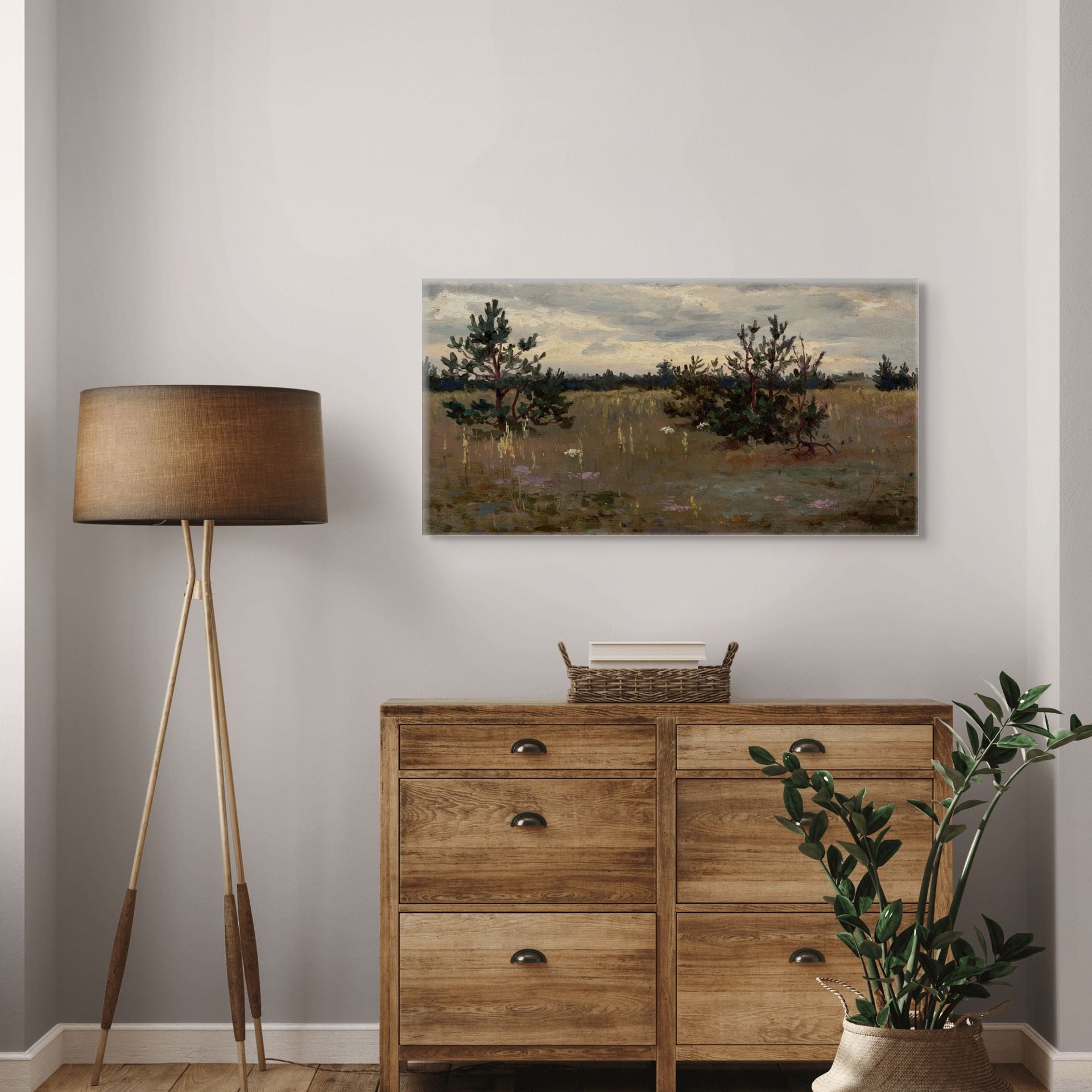 Bring the serene beauty of nature into your home with Clearing with Pine Trees, a vintage landscape artwork by Jan Stanisławski. This timeless piece captures a quiet forest clearing with elegant pine trees bathed in soft, natural light. The earthy greens and warm tones create a peaceful, organic feel that complements both modern and rustic interiors.