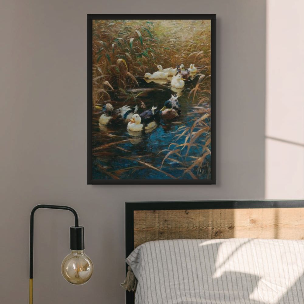 Celebrate the charm of wildlife with Ducks in Autumn Reeds, a detailed painting by Alexander Koester. This serene artwork depicts ducks gliding through golden autumn reeds, capturing the warm tones and peaceful atmosphere of fall. Perfect as wall art for modern homes, French country decor, or nature-inspired interiors.