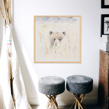 A soft and adorable watercolour painting style print on canvas of a brown bear cub hiding in the tall, pale grass. A welcoming addition to any space. Cute and welcoming watercolor artwork on canvas.