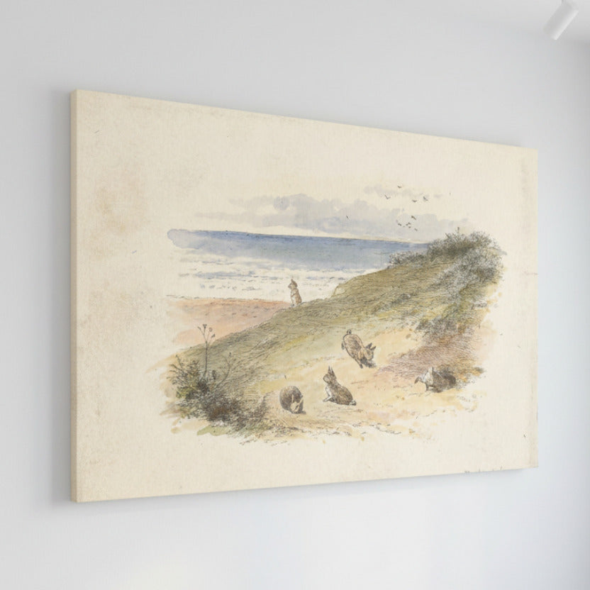 Add a touch of vintage charm to your home with this classic reproduction of "Rabbits (Tail Piece)" by the prolific 19th-century British illustrator Alfred W. Cooper. Originally created as a wood engraving for children’s literature and natural history publications, this piece captures the playful and serene essence of rabbits in their natural habitat.